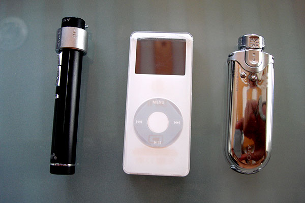 The Sony S2 Sports Walkman (also known as the NW-S205F) reviewed here represents the current flagship model of Sony’s new line of sports-activity digital audio players. For the North American market, all the models are black in color. There is also a NW-S203F model which is functionally equivalent but comes in a smaller capacity (1GB). The Japanese domestic market has other colors available. The unit is pretty diminutive and surprisingly light. For size comparison, here’s a shot of the device compared to other players and my hand.